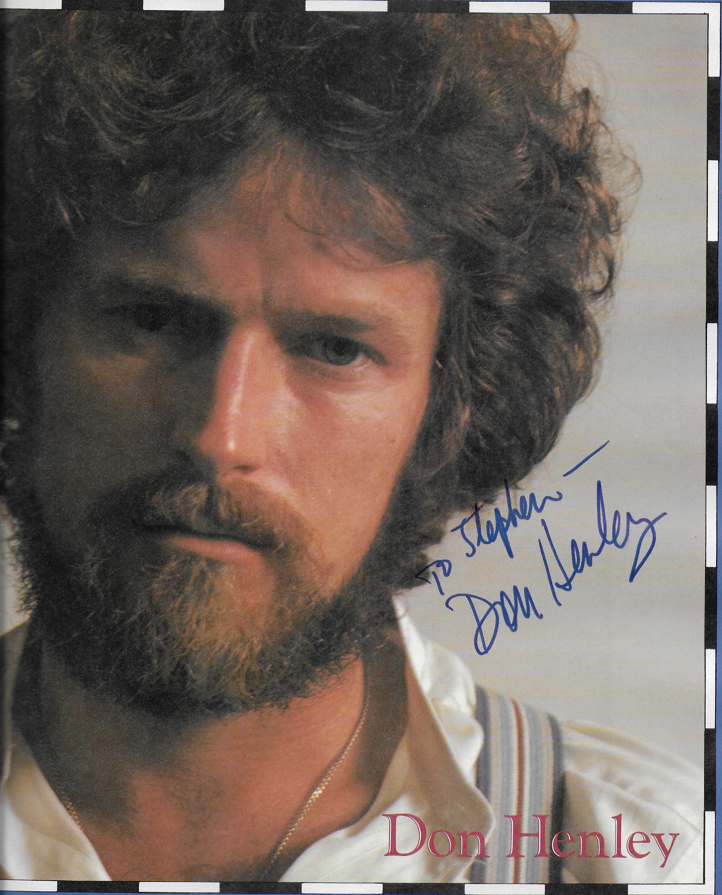 Don Henley, December 7, 1991 was a date where Mr. Henley autographed over 40+ items for me at the KLSX Record Swap and Convention at The Los Angeles Bonaventure Hotel.